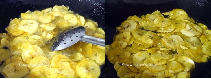3. If you are not confident with slicing banana direct to hot oil, you can try an another method also for this recipe. First slice and collect all banana in a mixer bowl, add salt and turmeric, sprinkle bit water and mix well. Spread and dry(individually,without touching each other) it on a dry cloth on a flat surface for 15 minutes. When its dry, heat the oil and fry them until crispy and light.Personally,the former process is okay for me, anyone really concern about hot oil and its splutter please try this method