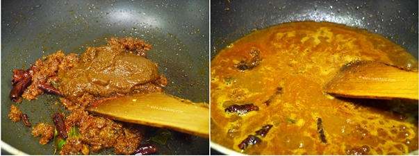 12. Pour strained tamarind juice/water (1cup) and extra 1cup water, mix well.
