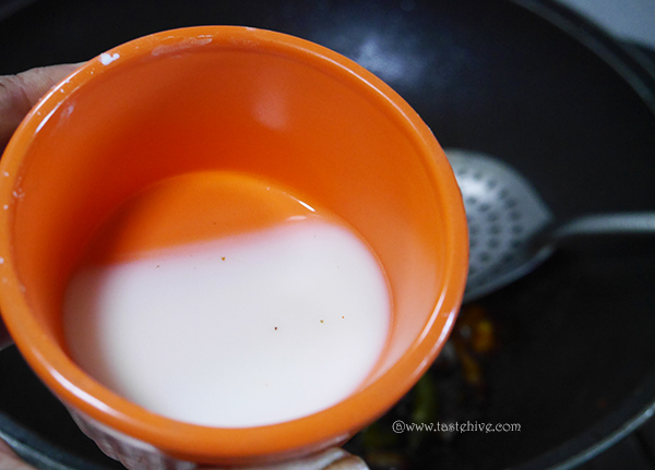 7. In a bowl, add one teaspoon cornstarch with 4 tablespoons of water. Mix until no lumps are seen, making a thin cornstarch liquid. Then pour it directly into the pan and mix well with the sauce.